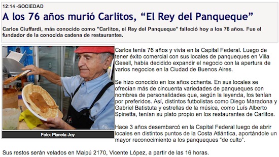 Me enteré por Twitter, el blog del Capitán y Télam, que se murió Carlitos, el tipo que hizo una cadena nacional a partir los panqueques más ricos que comí en mi vida.